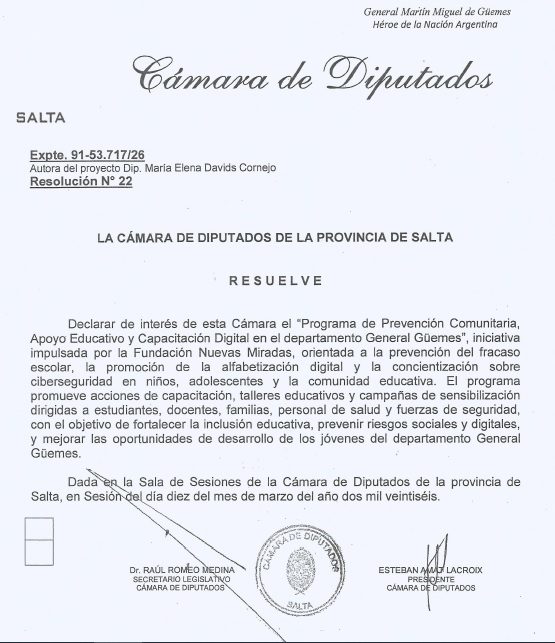 La "Fundación Nuevas Miradas" tiene como objetivo primordial la "capacitación", prevención, tratamiento y rehabilitación de la salud y sus implicancias, como así también cooperar con otras O.N.G, instituciones publicas y/o privadas con el fin de asistir con recursos y servicios. También se propone promover y preservar la salud , de la comunidad priorizando los sectores que carecen de recursos y evidencian condiciones desfavorable impidiendoles una inclusion social digna.
